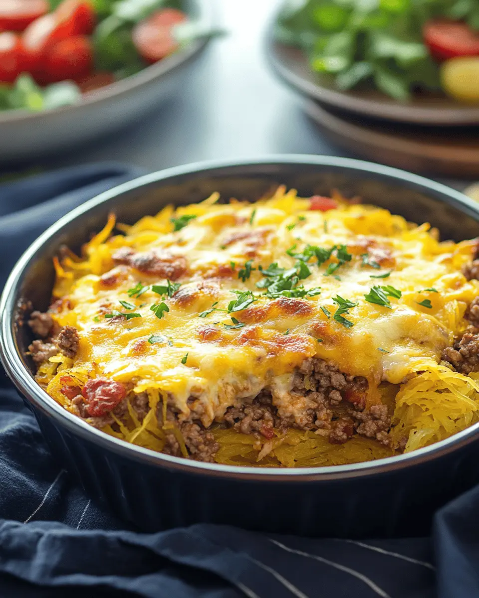 A delicious low-carb casserole that combines the flavors of cheeseburgers with spaghetti squash.