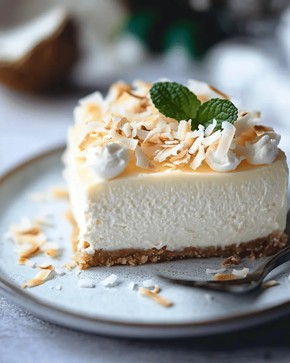 To take the cheesecake to the next level, serve it with a dollop of coconut whipped cream. Made from chilled coconut cream whipped until fluffy, it complements the coconut flavor in the cheesecake perfectly. This is a simple yet luxurious addition that adds richness to every slice.