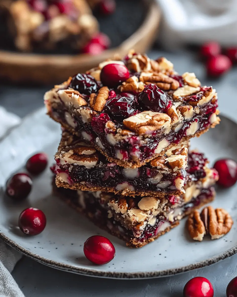 These bars combine the rich taste of chocolate with the tartness of cranberry, creating a delightful contrast that excites the palate. The crunchy pecans and chewy coconut add satisfying texture, making every bite a treat. Plus, they are easy to prepare, taking only 45 minutes from start to finish!