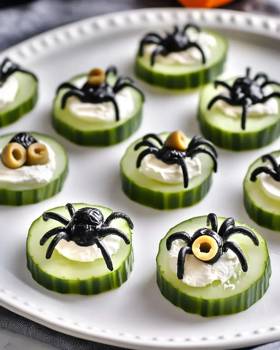 Delicious and visually appealing keto spider cucumber bites perfect for parties or snacking.
